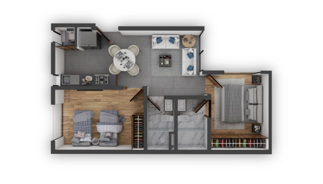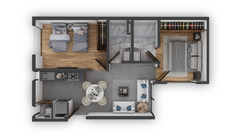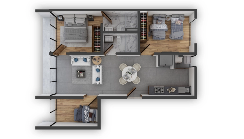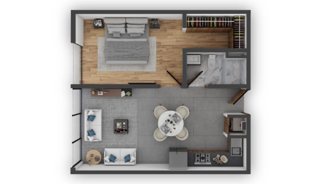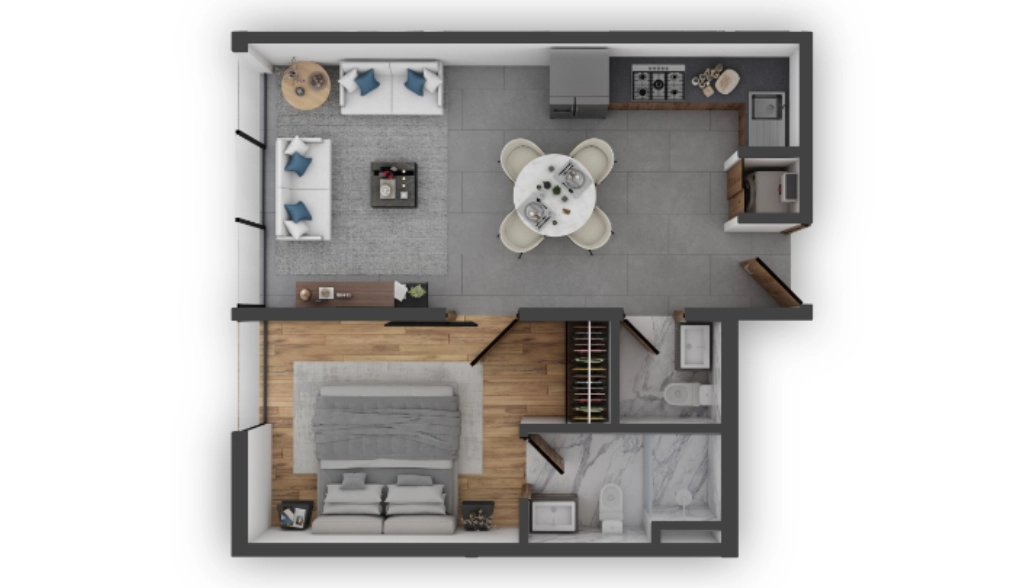 Selecciona el departamento de tu gusto: desde 50 hasta 155 metros cuadrados: una recámara más alcoba, dos recámaras o con opción a 3; muchos cuentan con su terraza propia. Todos ofrecen iluminación y ventilación natural en todos los espacios habitables.